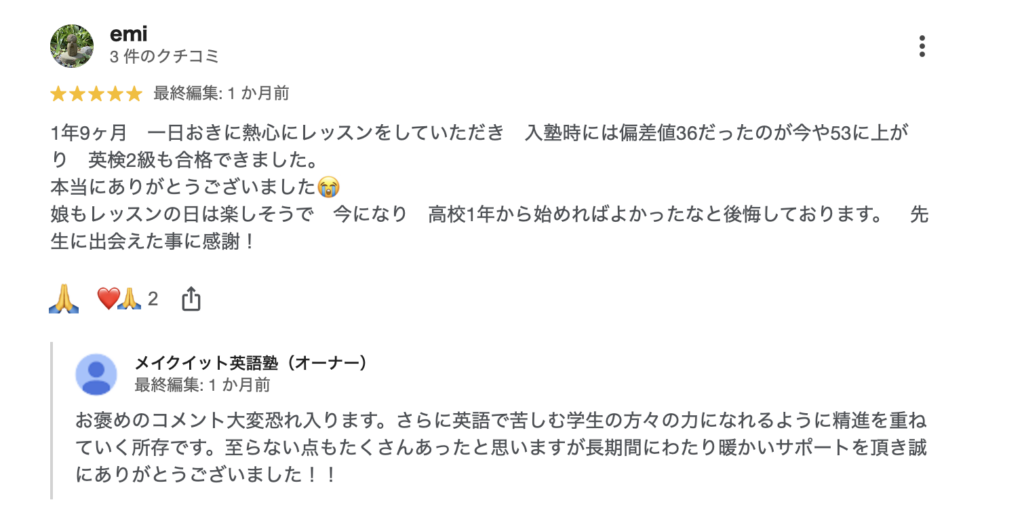 お客様にメイクイット英語塾の授業に対して貴重なご意見を頂いております。